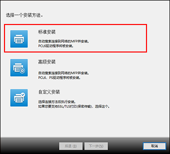 弹出[驱动程序安装]界面,选择[标准安装]。